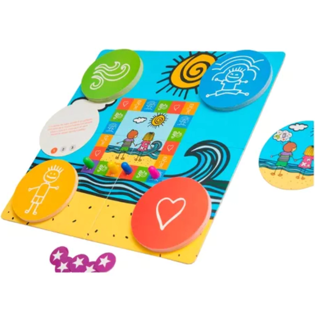 Contiene un tablero en cartón montado con distintos casilleros donde a medida que se avanza cada uno propone trabajar con los distintos aspectos del mindfuness: Los sentidos, la respiración, el cuerpo y la compasión. Es un juego colaborativo donde todos llegan a la meta y el primero en llegar colabora con el resto de los participantes para que logren el objetivo también.