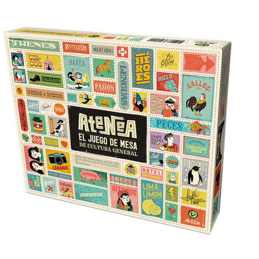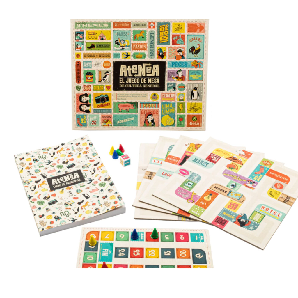 Atenea es un juego de mesa de preguntas sobre cultura general. De todos nuestros juegos de cultura general, Atenea es ideal para los chicos que arrancan con juegos de conocimiento.Hay cuatro tableros reversibles que se conectan entre sí y cada casillero determina un tema distinto. Con el dado, recorré el tablero respondiendo las preguntas de los más de 200 temas que tiene este divertido juego de mesa. Se deben responder 3 preguntas por turno, con y sin opciones. Que el tema a responder no te engañe ¡no es tan lineal! En el casillero “Leones” no solo te preguntarán sobre el rey de la selva, también te podés encontrar una selección de hockey o un político ruso. Cantidad de jugadores: 2 a 4