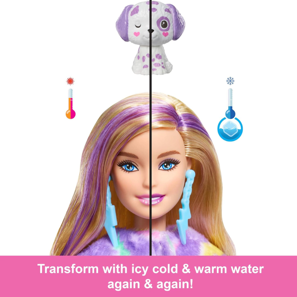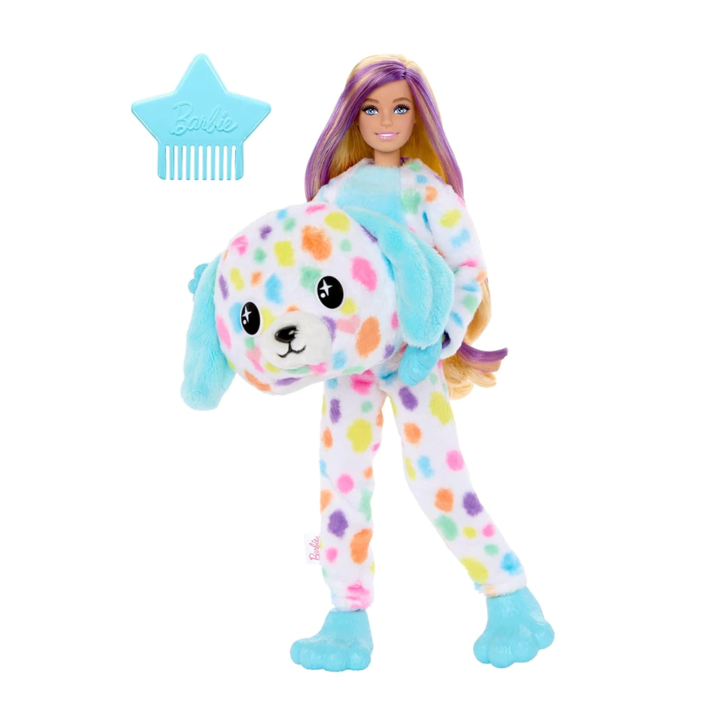 Incluye: 1 recipiente unboxing con 1 muñeca articulada Barbie, disfraz de dálmata blanco con manchas de colores, chaqueta reversible y máscara convertible en cojín para la mascota, 1 mascota y 1 peine para la muñeca.