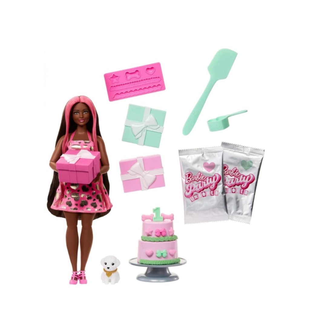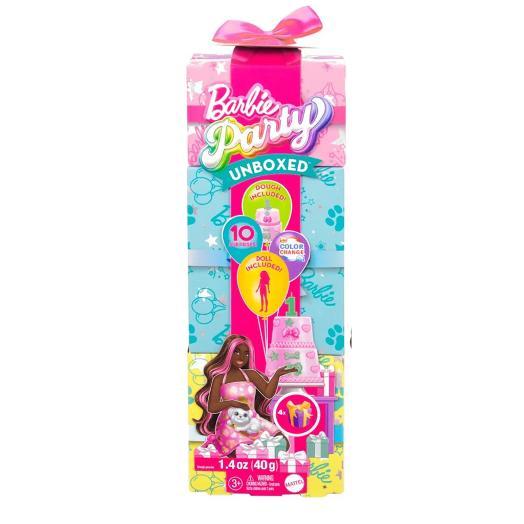 Las muñecas Barbie Party Unboxed están listas para celebrar con lindos accesorios de fiesta y mascotas con lindos atuendos.Con 10 sorpresas en un solo paquete, las muñecas Barbie Party Unboxed brindan una experiencia única de desempaquetado con un empaque inspirado en una caja de regalo y diversión con temática de cumpleaños de mascotas. Segi "desenvolviendo" los regalos para encontrar modas de fiesta, una adorable mascota con accesorio para disfrazarse y herramientas para decorar pasteles. Las jóvenes creativas pueden usar la masa fácil de mezclar y preparar, la bandeja de moldes y las herramientas para hacer decoraciones para el pastel de cumpleaños de dos niveles incluido y organizar una fiesta de cumpleaños de mascotas. Más sorpresas incluyen cambio de color en la cara de la muñeca y la mascota: ¡simplemente usa agua helada y tibia para transformar, cambiar de color y repetir una y otra vez! ¡A los pequeños les encantará descubrir la fiesta dentro de esta serie Barbie Party Unboxed Pet Birthday y pueden coleccionarlas todas para que las sorpresas de la fiesta continúen!