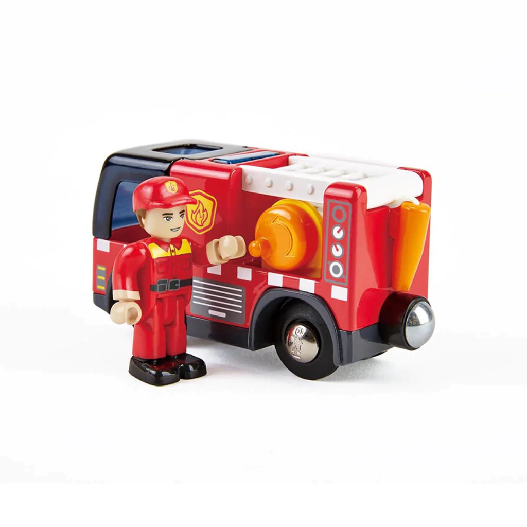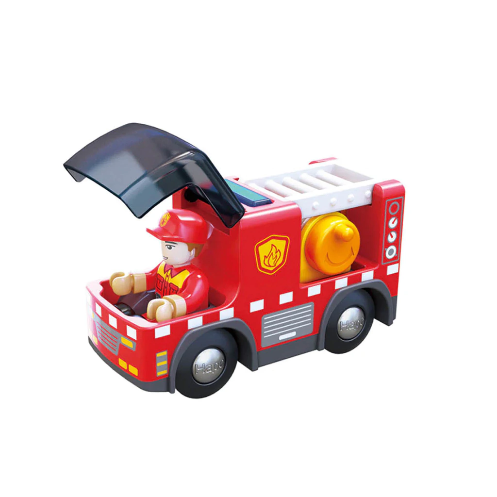 ¡Hay un fuego que apagar! ¡Enciende la luz y la sirena y lleva el camión de bomberos al lugar del accidente! Incluye un carrete de manguera contra incendios, una escalera móvil y una escotilla de cabina que se abre.