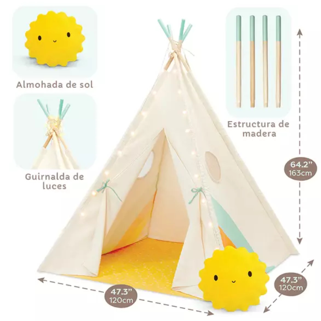¡La carpa Happy Hideaway de B. Spaces es el lugar perfecto para jugar con amigos o amigos de peluche! Esta carpa de juegos para niños está hecha de tela de algodón y cuenta con una base incorporada, dos ventanas redondas, patrones de arcoíris y luces de cadena parpadeantes. También viene con postes de madera y un kit anticolapso que mantiene firmemente esta tienda en su lugar. ¡Sin mencionar que la tienda Happy Hideaway incluye una cómoda almohada en forma de sol para darle un toque extra de comodidad! Esta tienda de campaña interior también funciona como un gran rincón de lectura, un fuerte divertido, un lugar para pasar la noche o como pieza central de un campamento imaginario. Y mientras los niños juegan, aprenden, descansan y sueñan en esta moderna tienda de campaña, ¡también desarrollarán su creatividad e independencia!