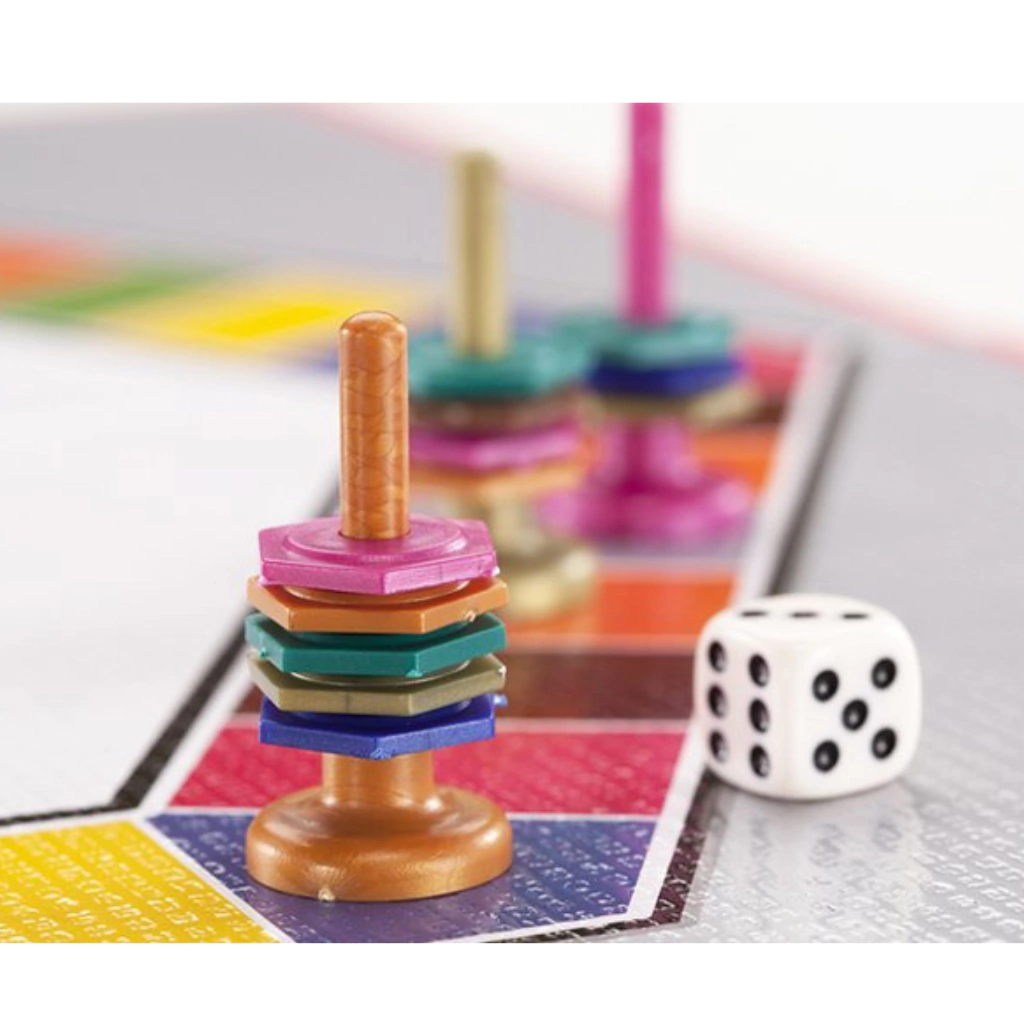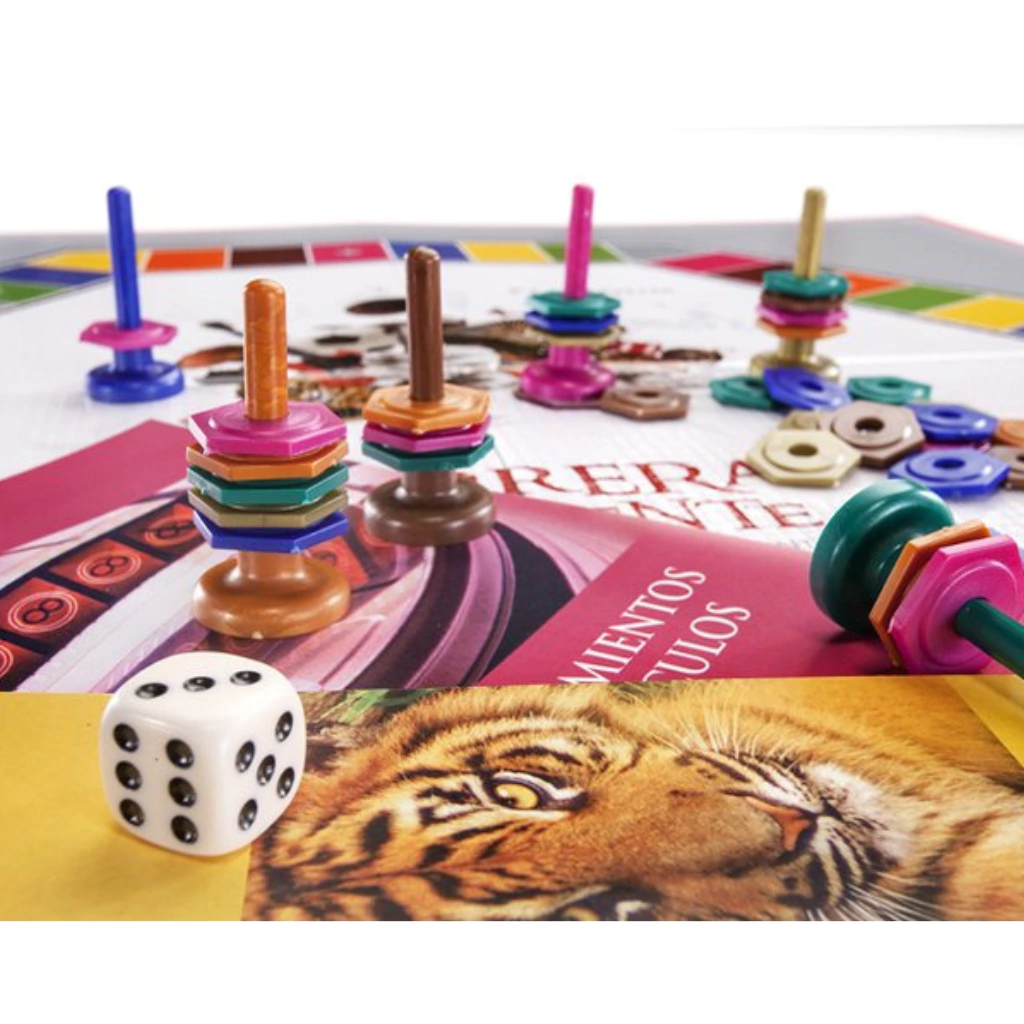Contiene: 1 tablero, 6 cuadernillos con preguntas y respuestas, 1 dado, 6 clavijas 36 fichas-premio.