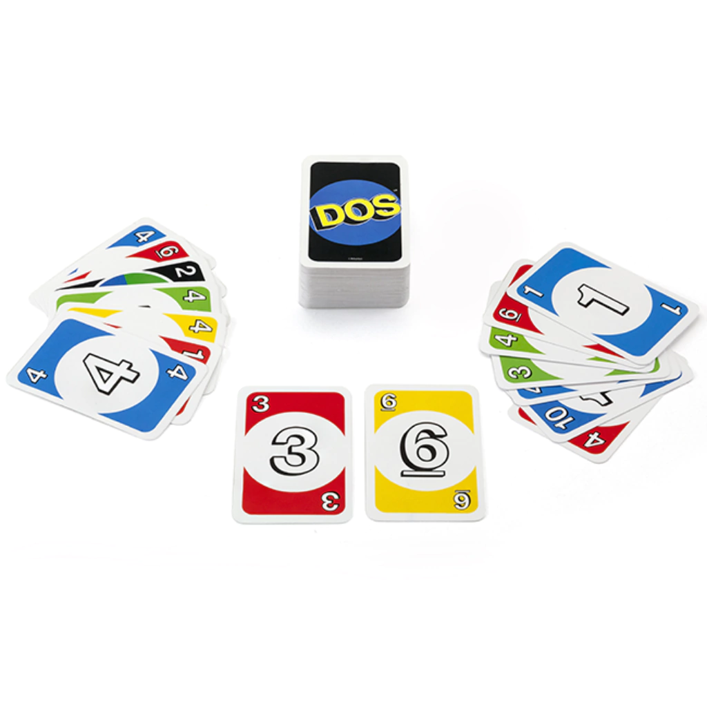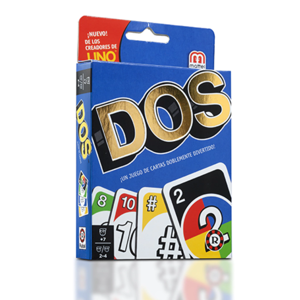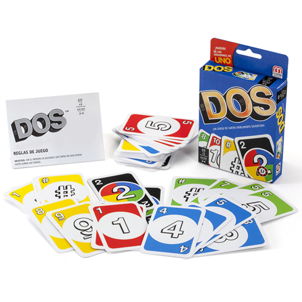 DOS es un juego especial, al igual que el UNO, consiste en deshacerse de las cartas de la mano antes que los demás jugadores. Sin embargo, la mecánica es muy diferente: todos los participantes tienen que tirar cartas sobre una fila central armando juegos y sumando pares. Los requisitos a la hora de tirar son menos intuitivos, por lo que el jugador puede desarrollar estrategias a la hora de descartarse. DOS requiere mente fría, concentración, y por supuesto, la atención necesaria para cantar “¡DOS!” antes de terminar.