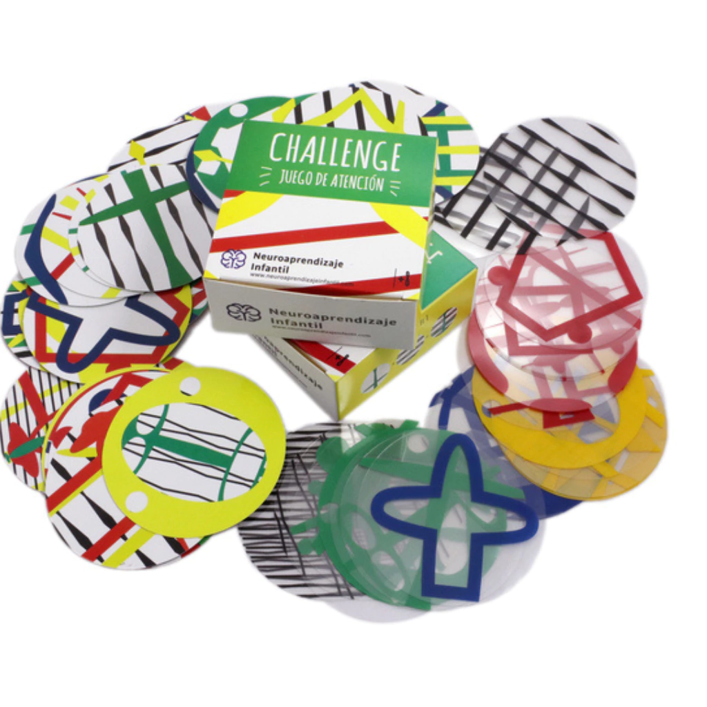 Challenge es un juego de cartas que propone la estimulación de procesos atencionales, viso- perceptivos, de memoria visual y razonamiento espacial. El objetivo es analizar los desafíos, retener en la memoria de trabajo su forma o color y dar una respuesta adecuada. Una segunda etapa implica la identificación del orden en el cual la superposición de patrones determina la realidad completa. Se proponen ejercicios en 3 niveles de complejidad. Este juego puede ser utilizado por niños a partir de los 8 años de edad, así como por adultos mayores con riesgo de deterioro cognitivo.