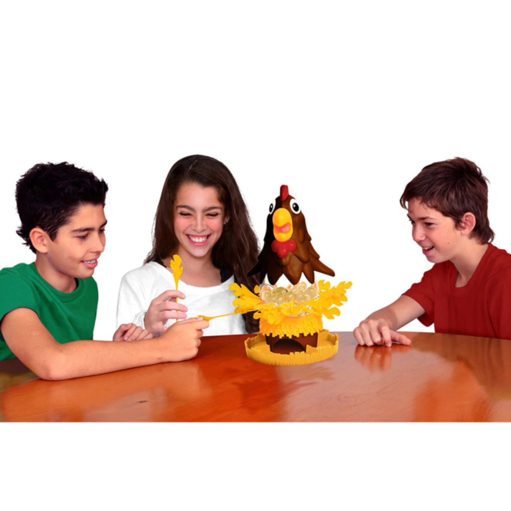 Quítale las plumas a la gallina y no dejes caer ningún huevo. Un juego divertidísimo para jugar en familia o con amigos. Continuará hasta que todos los huevos o palitos plumas se hayan caído. Para desafiar tu precisión.