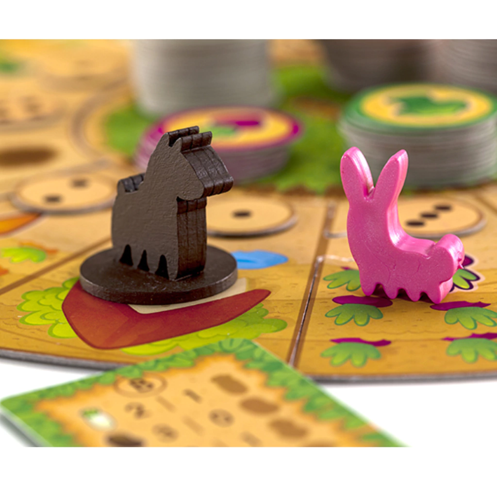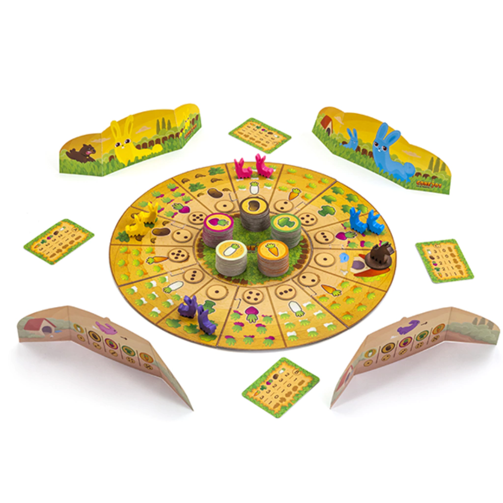 Contiene: 1 centro de huerto, 7 baldosas de huerto, 15 fichas de número, 8 figuras de conejo (2 de cada color), 1 figura de perro, 12 tarjetas de puntos, 4 biombos, 120 fichas de hortaliza (24 de cada variedad), 1 reglamento.