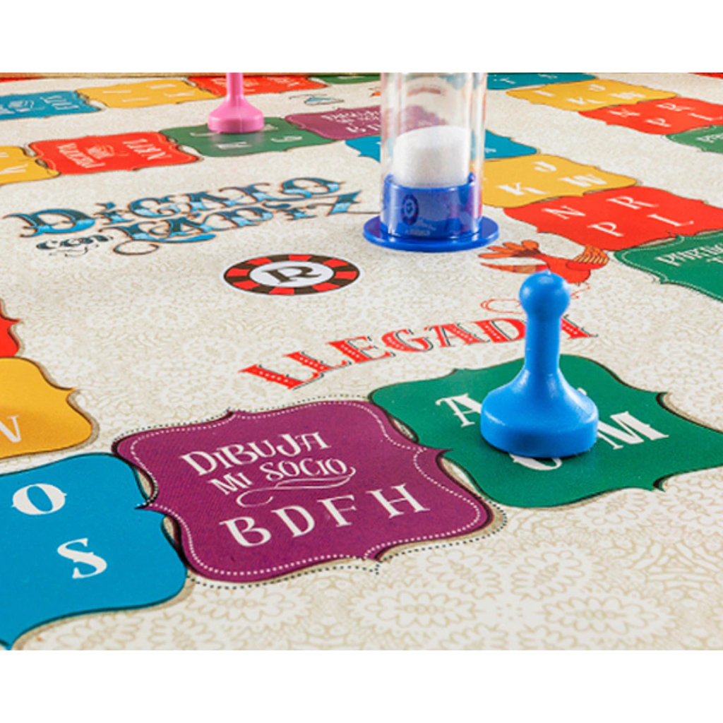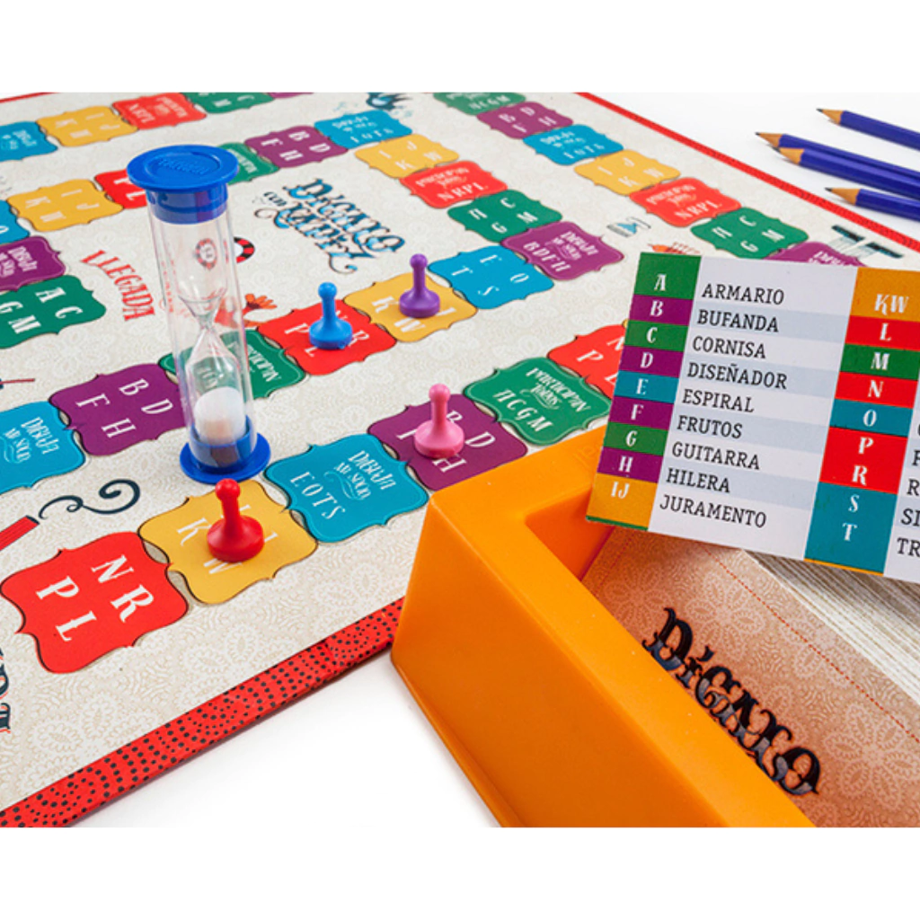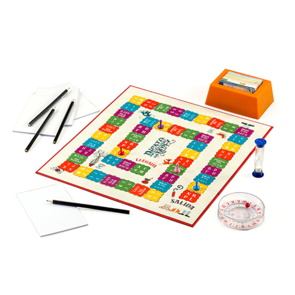 Contenido: 1 tablero de juego, 72 tarjetas bifaz con 2448 palabras, 1 porta-tarjetas, 4 peones, 4 lápices, 4 blocks, 1 ruletra, 1 reloj de arena, 1 reglamento.
