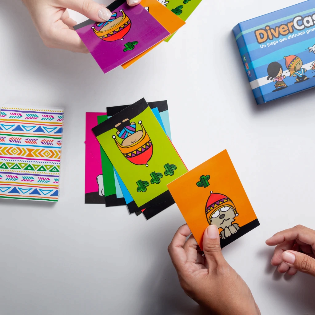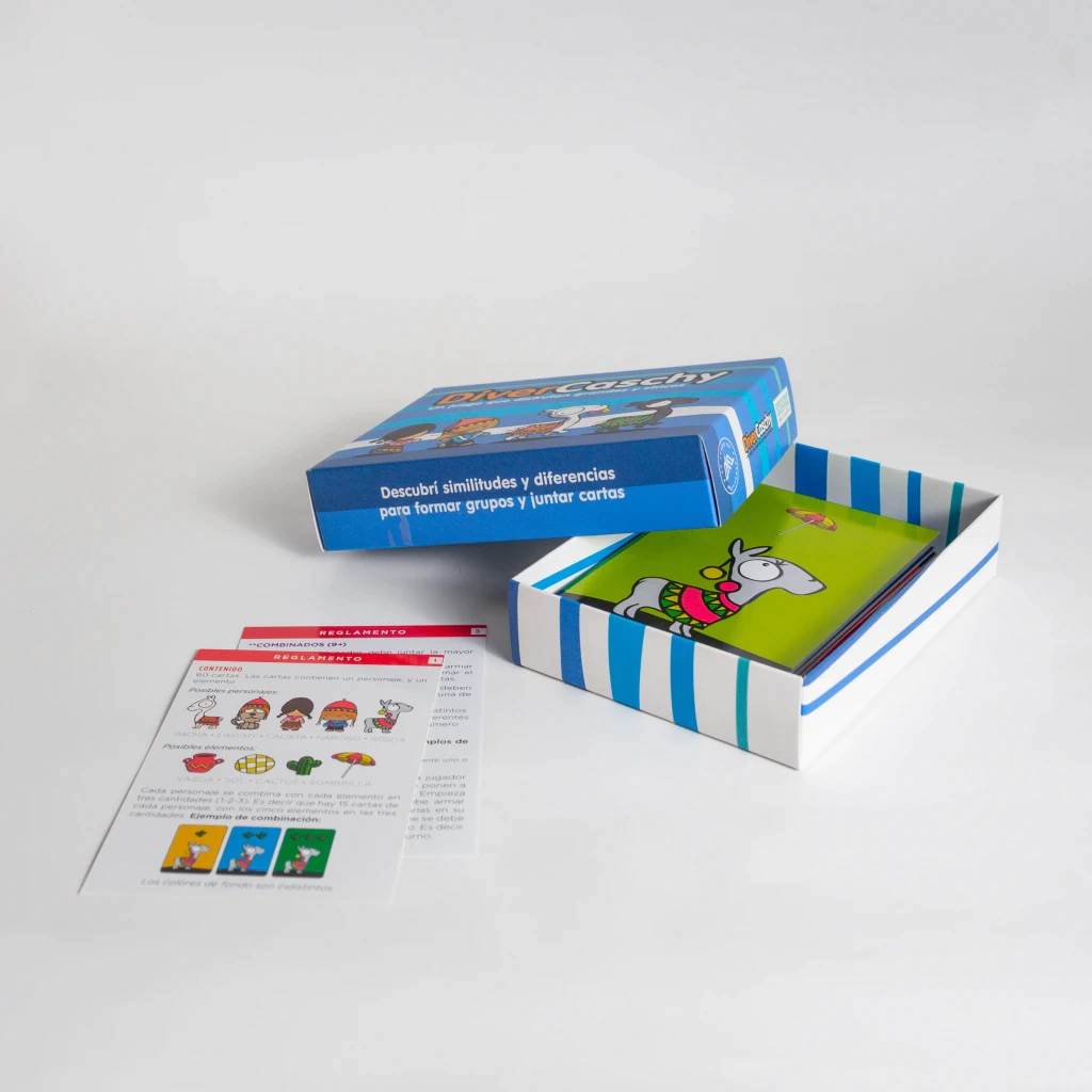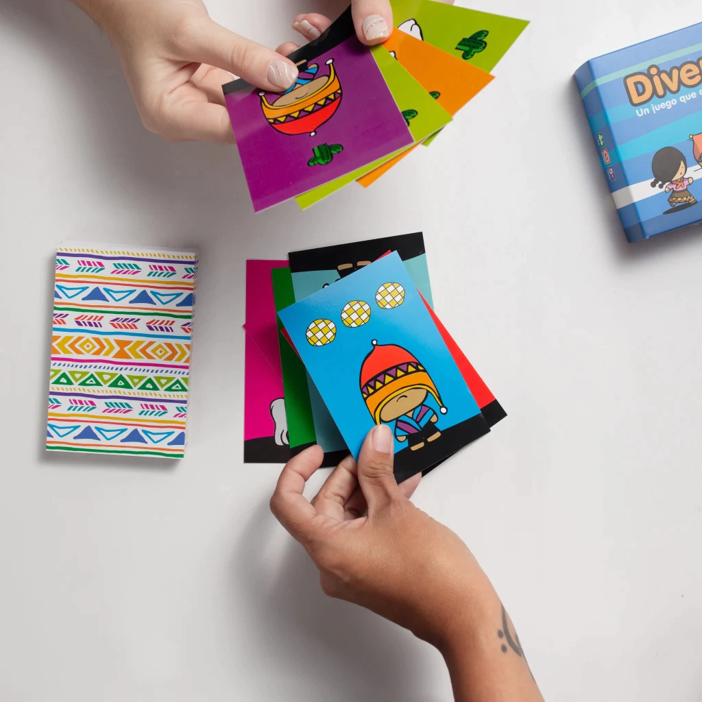 Las tardes lluviosas no son un problema. Un mazo de cartas, mil posibilidades.Un juego de percepción visual y rapidez mental.Un juego donde encontrar patrones y objetos iguales van a darte la victoria. Con hermosos personajes de la PUNA salteña.Los jugadores deben buscar entre las cartas de sus manos y las cartas disponibles en la mesa, aquellas que se combinen correctamente para poder armar grupos de tres. El que consigue más cartas al final de la partida es el ganador.