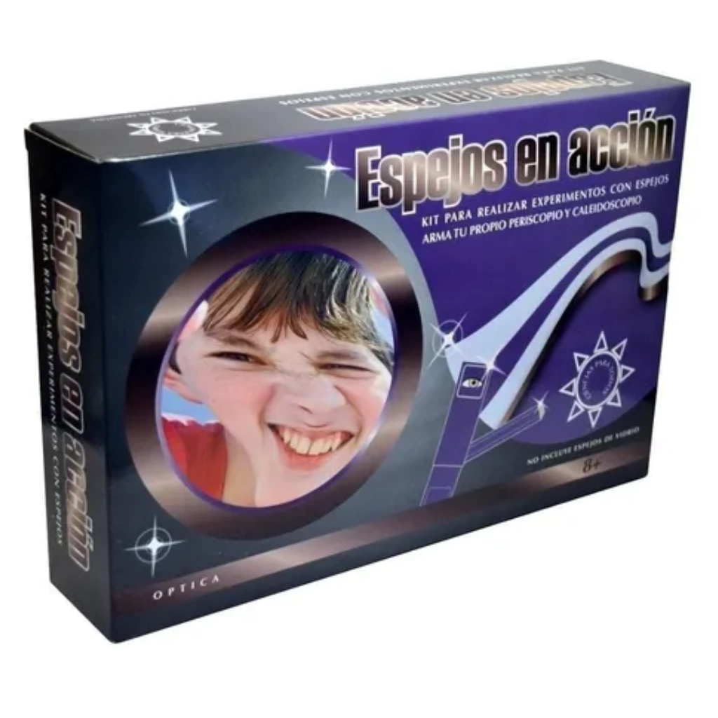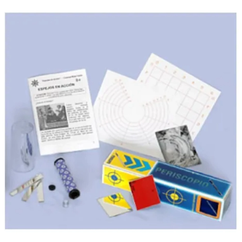 Incluye: 1 periscopio para armar,1 caleidoscopio para armar, 2 espejos planos, 1 espejo flexible, Fichas para realizar anaformismos, 1 vaso plástico, 1 guía de experimentos