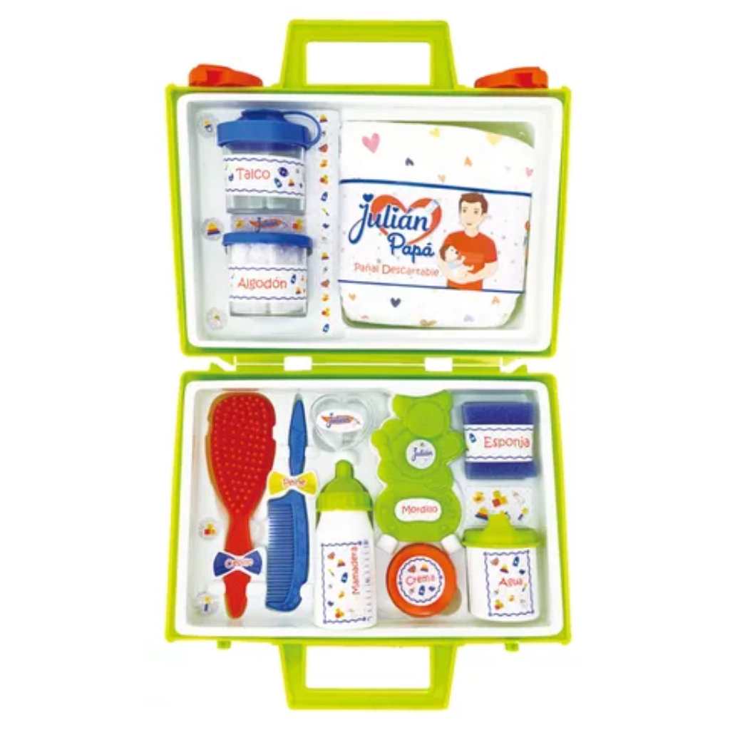 La Valija Julian Papá es el set de juego perfecto para los pequeños que quieren cuidar de sus muñecos como verdaderos papás. Este encantador kit incluye pañal, talco, algodón, mamadera, mordillo, agua, crema, esponja, peine, cepillo y un adorable frasco con forma de corazón. Con todos los accesorios necesarios, los niños pueden disfrutar de horas de juego imaginativo, desarrollando su creatividad mientras cuidan de sus "bebés". ¡Ideal para fomentar el juego de roles y la ternura!