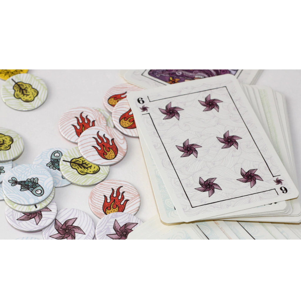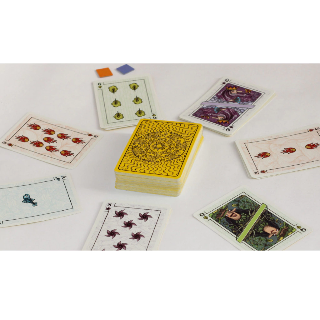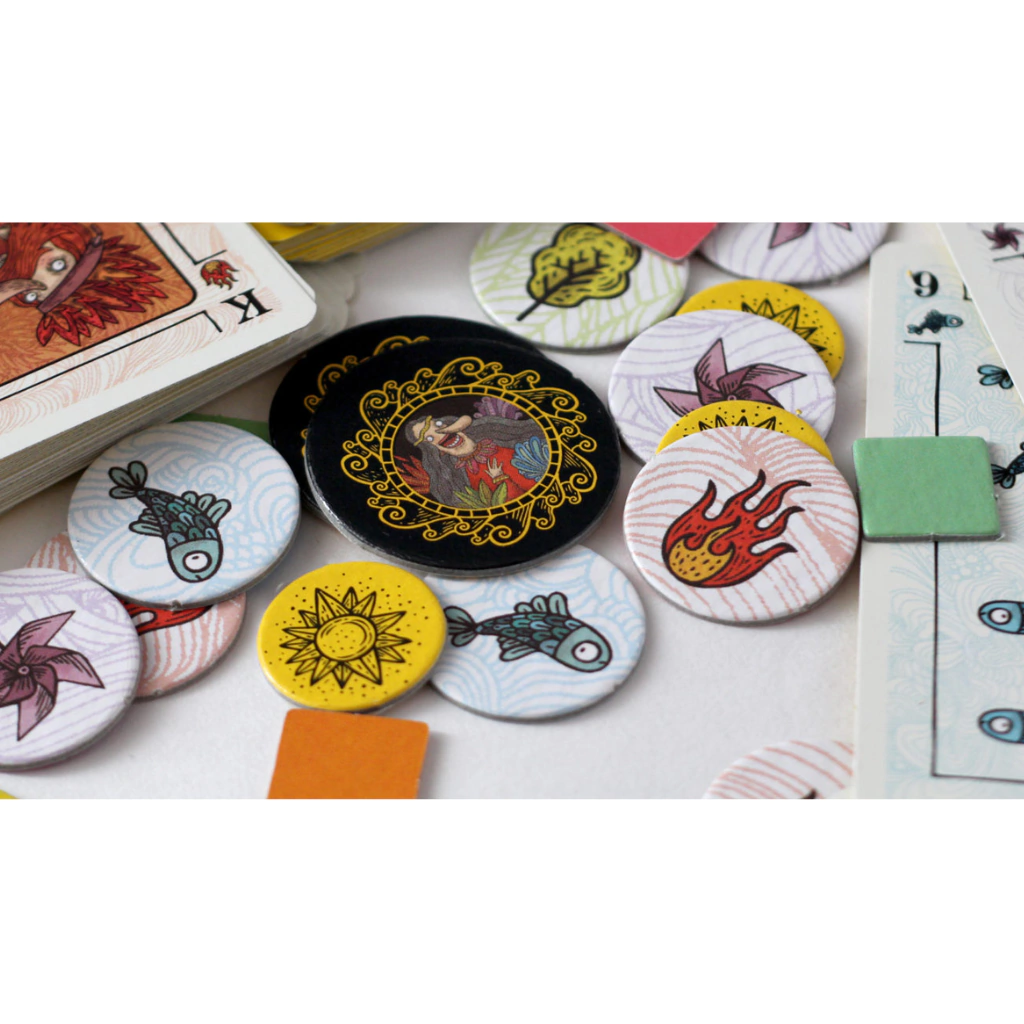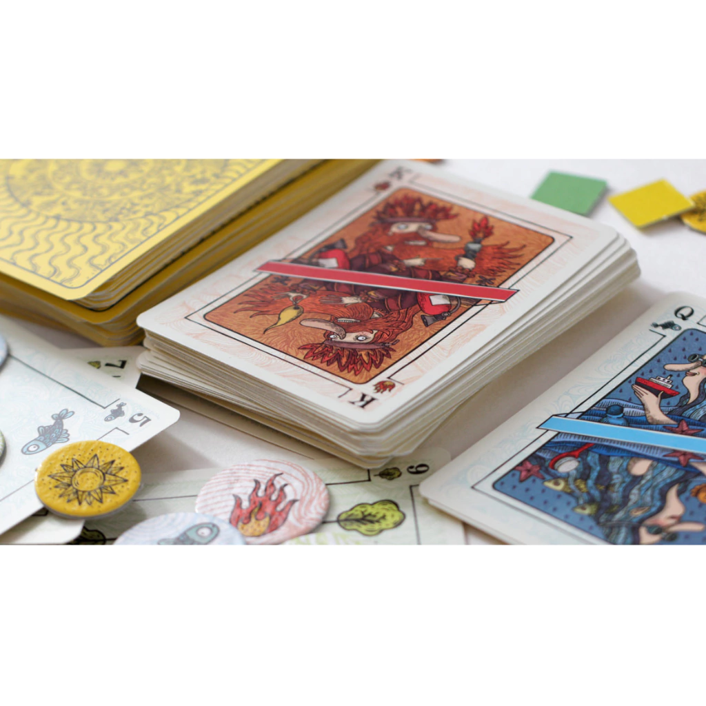 Contenido: 2 mazos de 52 cartas, 35 Macas, 8 amuletos, 24 fichas de elementos, 15 monedas, reglamento