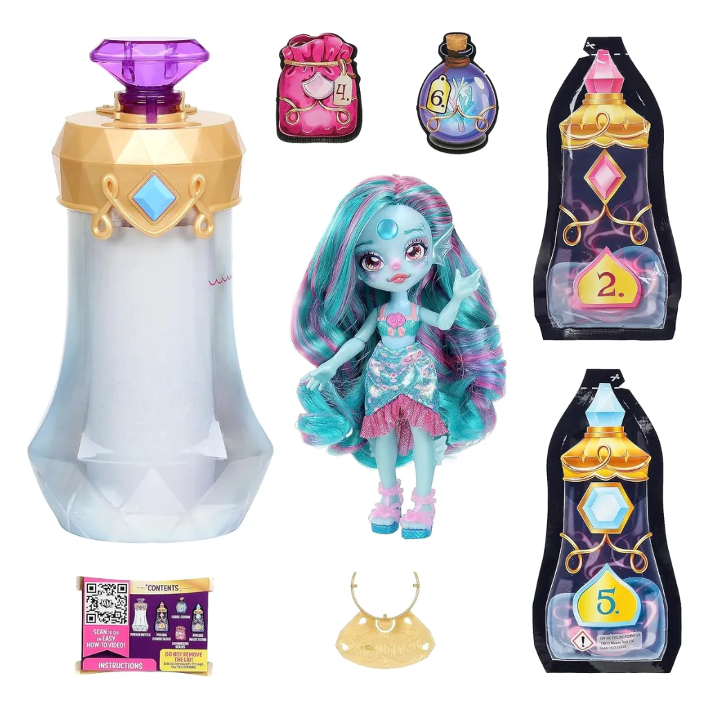 ¡Desde una tierra donde las pociones fluyen de cascadas y fuentes, este Pixling transmite momentos mágicos y alegría! Ahora las pequeñas pueden mezclar su propia poción especial para revelar mágicamente esta hermosa muñeca Pixling. Para crear su poción, combine agua con los ingredientes mágicos incluidos en la botella de poción. La poción se arremolinará y se mezclará hasta adquirir un color azul oscuro intenso dentro de la botella. Luego dicen las palabras mágicas, "Magicus Mixus", mientras giran y luego presionan la Gema de Cristal. Ante sus ojos, la poción azul se vuelve clara, ¡revelando mágicamente una muñeca sorpresa!¡Hay 3 Pixlings diferentes para que las pequeñas creen y coleccionen mágicamente! Cada muñeca de 15 cm tiene 7 puntos de articulación para posar fácilmente y está bellamente detallada con un hermoso cabello largo que se puede cepillar, una gema de perla mística en la frente, moda suave con acabados iridiscentes y zapatos hechos a mano.
