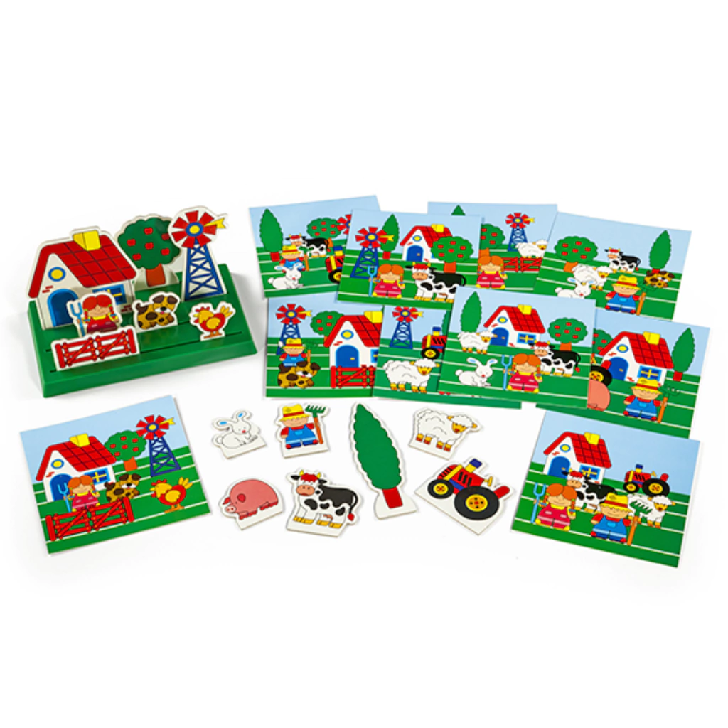 Contiene: 1 base plástica, 10 tarjetas con escenas campestres, 14 figuras troqueladas.