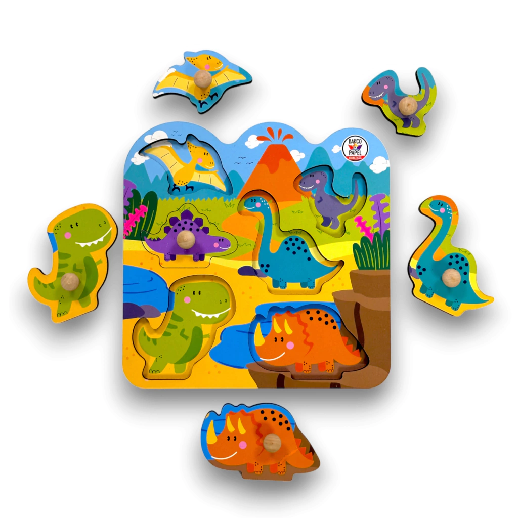 Incluye: 1 tablero, 6 piezas de madera super resistentes con forma de dinosaurios.