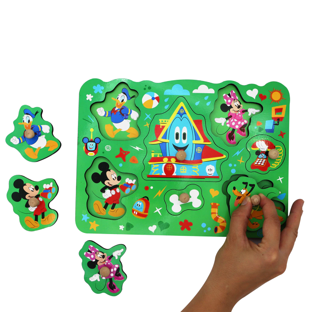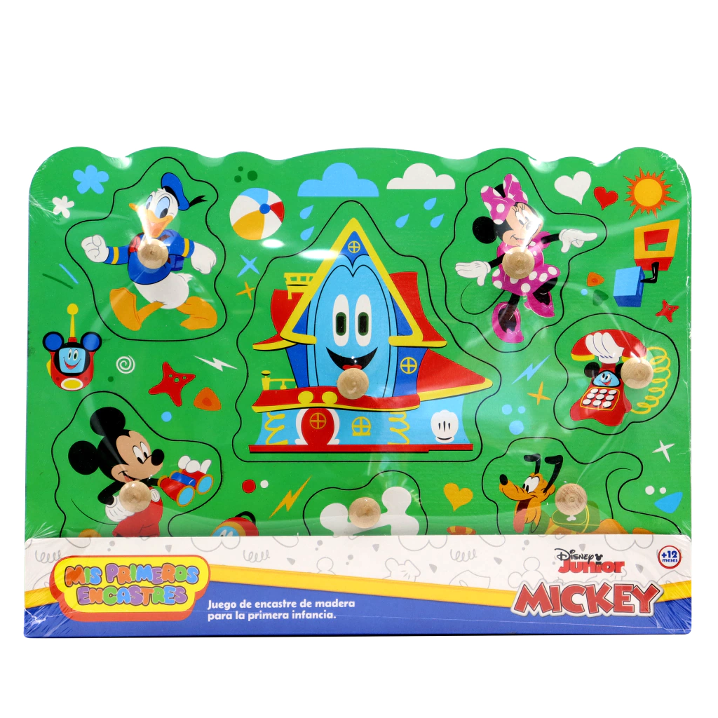 Inlcuye: 1 tablero, 7 piezas de madera super resistentes con forma de personajes de Mickey Mouse