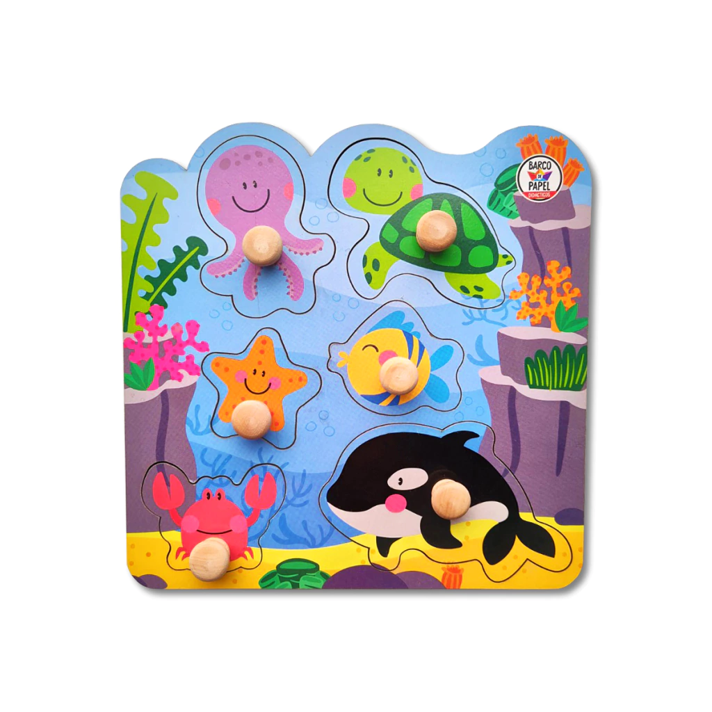 Incluye: 1 tablero, 6 piezas de madera super resistentes con forma de animales del océano.