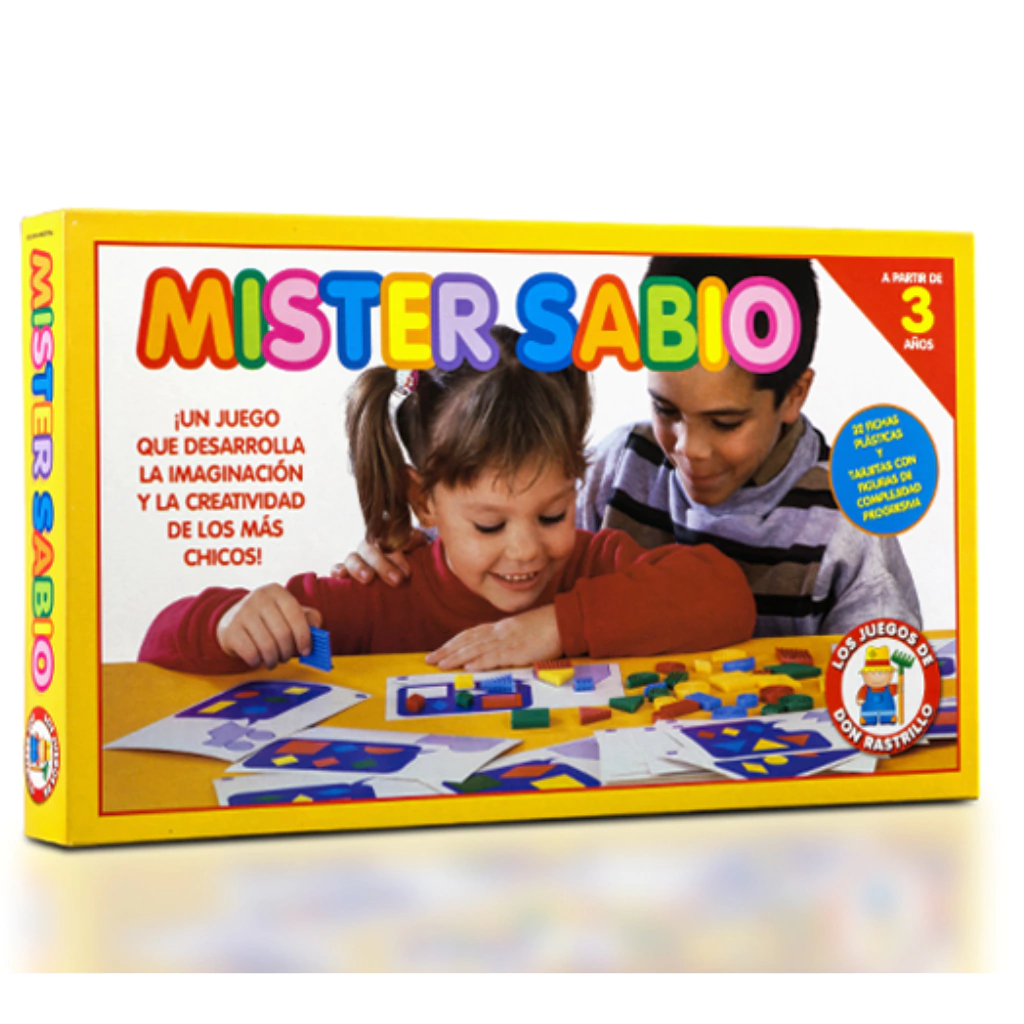 Mister Sabio es un entretenido juego de actividades individual ideados para desarrollar la creatividad en los mas pequeños a traves de la observacion y el reconocimeinto de formas y colores. Su objetivo es ampliar la capacidad de encontrar, hermanar y construir relacionando las distintas formas para crear nuevos esquemas. Por medio de un original grupo de tarjetas numeradas con diseños de complejidad progresiva, los pequeños experimentan con formas geometricas y colores basicos, aprendiendo a construir nuevas figuras en forma gradual y utilizando cada vez mas fichas. Una manera divertida de reconocer colores y formas. A la hora de jugar, deberán completar las figuras que proponen las tarjetas y crear nuevas siluetas.
