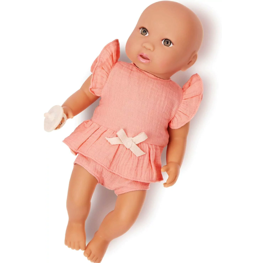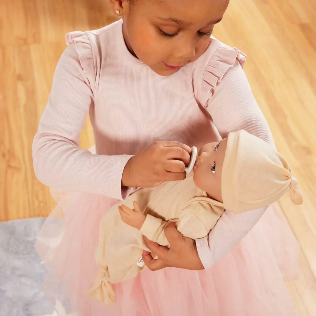 Incluye: una muñeca bebé , un pijama anudado y un sombrero en un tono de color neutro, un chupete, una bolsa sorpresa con un atuendo y una tarjeta de revelación de género.