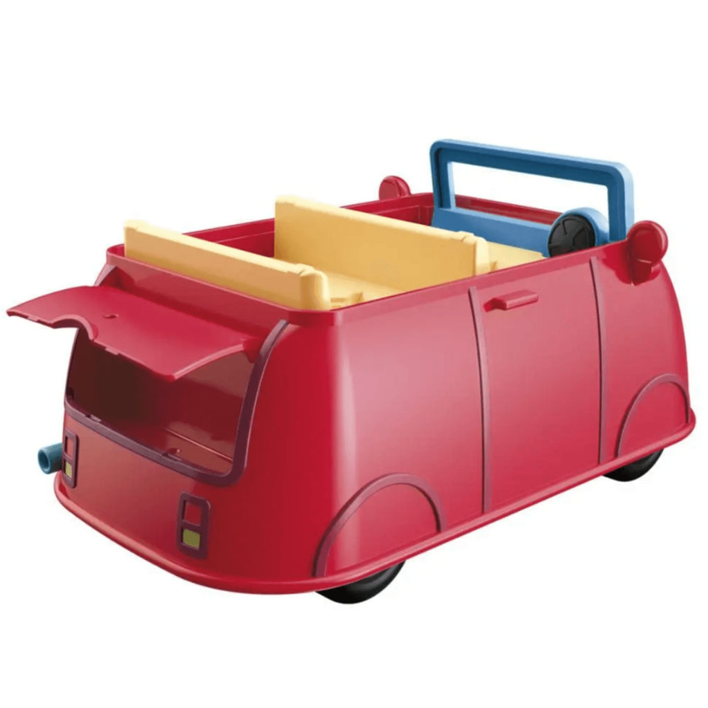 La familia de cerditos adora viajar juntos, y cuando viajan lo hacen en su fiable auto rojo. Viene con figuras de Mamá Cerdita y Peppa Cerdita para que paseen en el auto. ¡Los pequeños pueden imaginar que salen a comprar galletas para Papá Cerdito y George! Este vehículo de juguete rueda de verdad y cuenta con un maletero que se abre y se cierra. Y cuando los niños presionan el volante escuchan música de la serie, sonidos de la bocina y risas de Peppa. ¡Siempre es divertido salir a pasear en el auto rojo de la familia de cerditos!