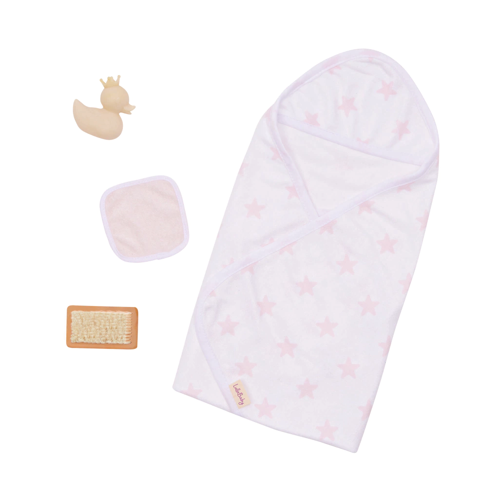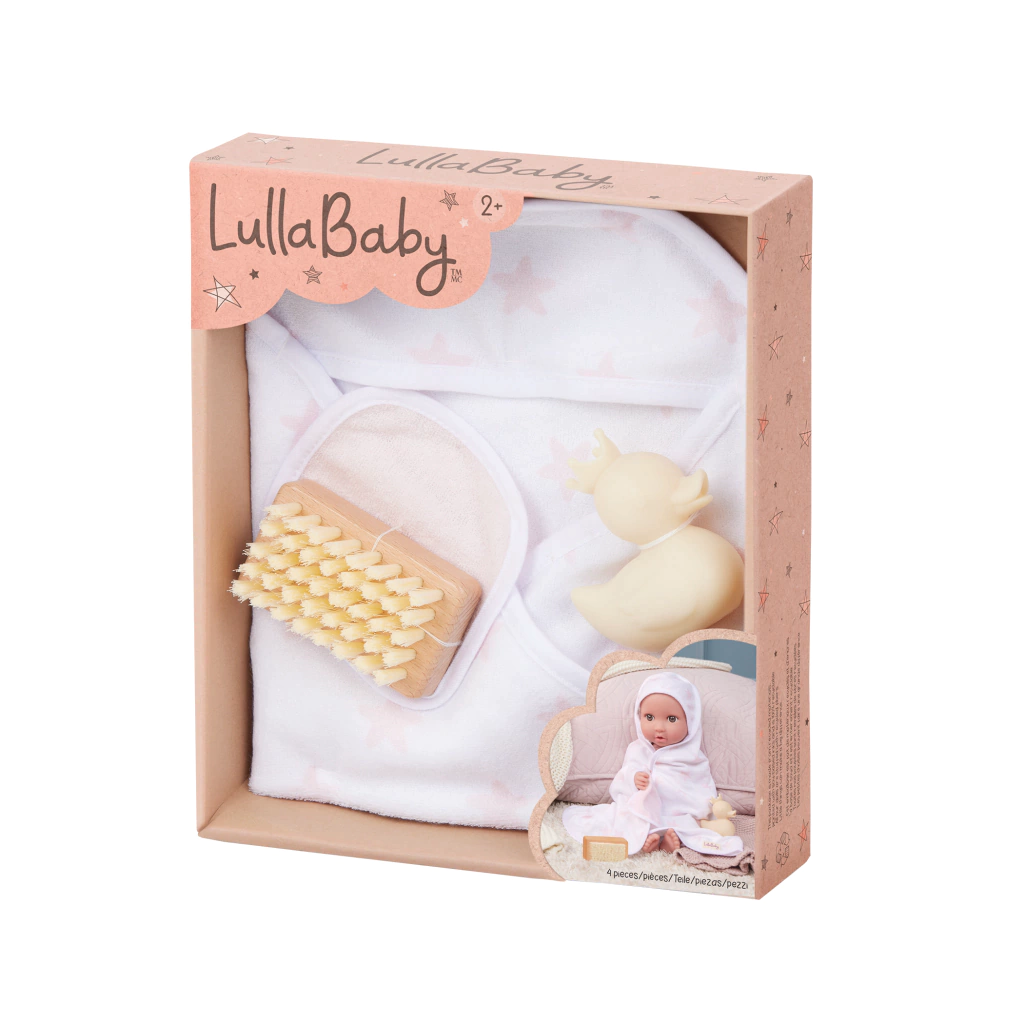 Prepara a tu bebé para la hora del baño con este bonito juego de accesorios de LullaBaby. Los pequeños pueden "bañar" a su bebé con divertidos accesorios para la bañera, que incluyen una toallita, un cepillo para fregar y un patito de juguete para que se divierta aún más. Después, es hora de secar al bebé y mantenerlo abrigado con la toalla de baño con capucha. Está decorada con un estampado de estrellas para que sea aún más adorable. Con el tamaño perfecto para que los pequeños las abracen, las carguen y las amen, las muñecas LullaBaby alientan a los niños a desarrollar empatía y cualidades afectivas mientras juegan y crecen con su muñeca. Este juego de accesorios para muñecas es compatible con la mayoría de las muñecas de 35 cm, la ropa y los accesorios para muñecas. Recomendado para niños de 2 años en adelante. Seguridad probada para cumplir con todos los requisitos reglamentarios de ftalatos y BPA. Las muñecas LullaBaby se venden por separado