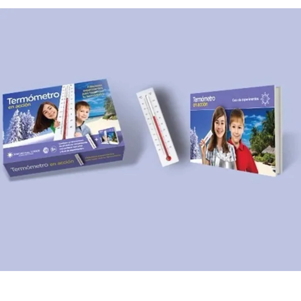 Contiene un termometro de alcohol, no contaminante (no contiene mercurio) y una guia de experimentos sobre temperatura ambiente, efecto invernadero, el calor, temperatura corporal, etc.