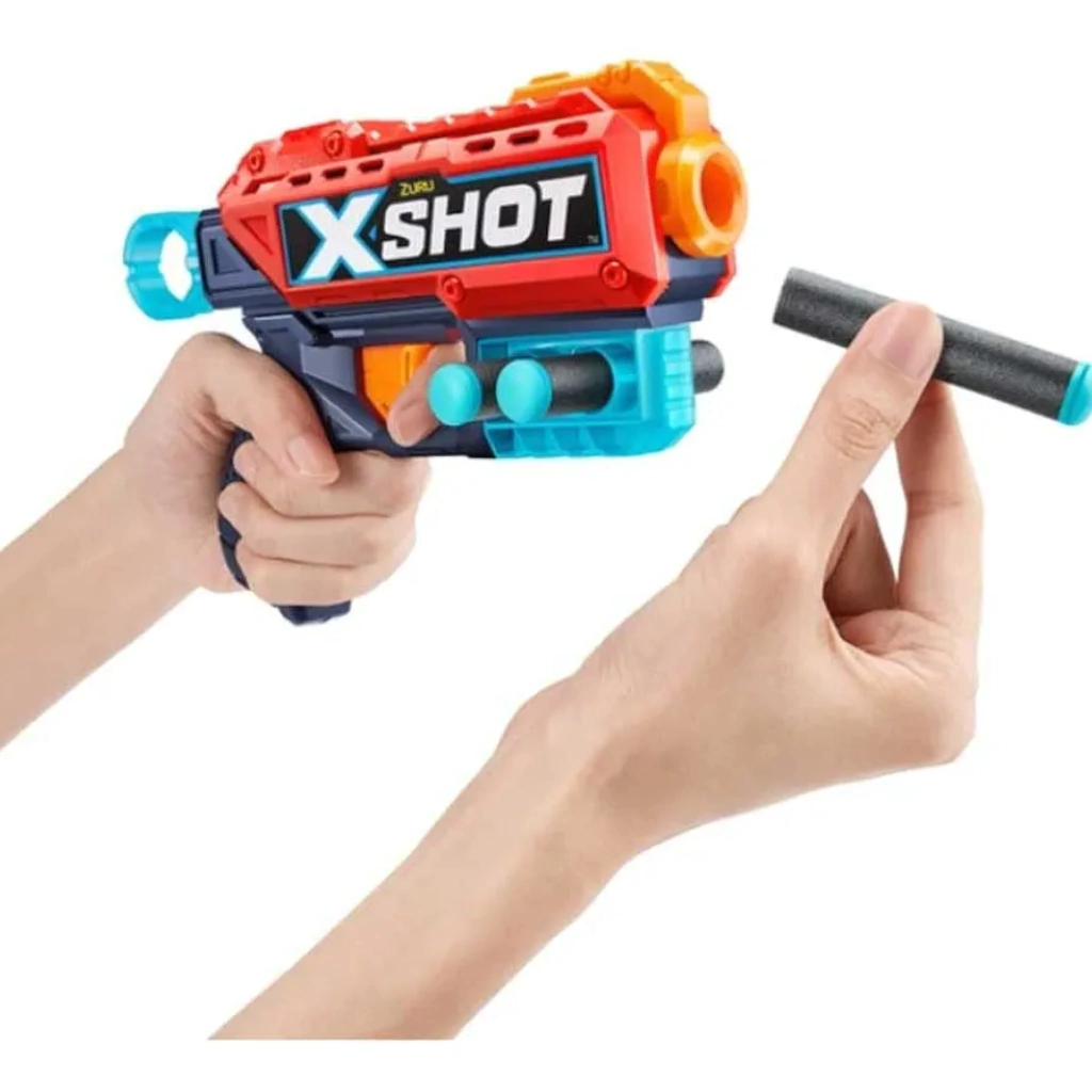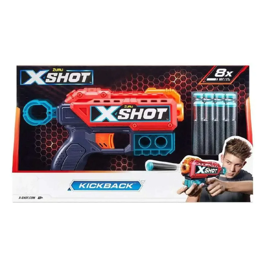 ¡El X-Shot Excel Kickback tiene suficiente potencia para disparar hasta 24 m de distancia! De hecho, ¡tiene tanta potencia que en realidad retrocede cuando se dispara! Con el mecanismo de recarga fácil y el almacenamiento de dardos en la parte inferior, nunca perderás la oportunidad de eliminar a tus oponentes.