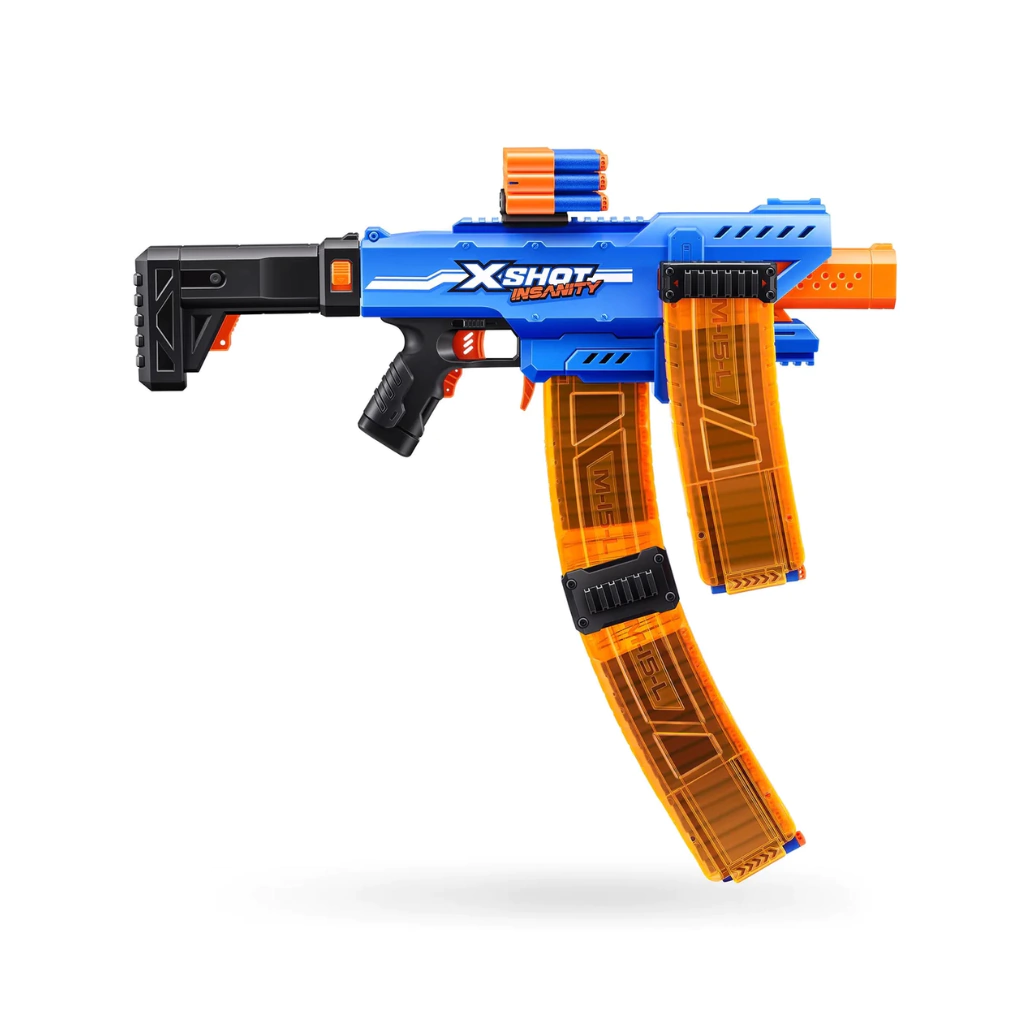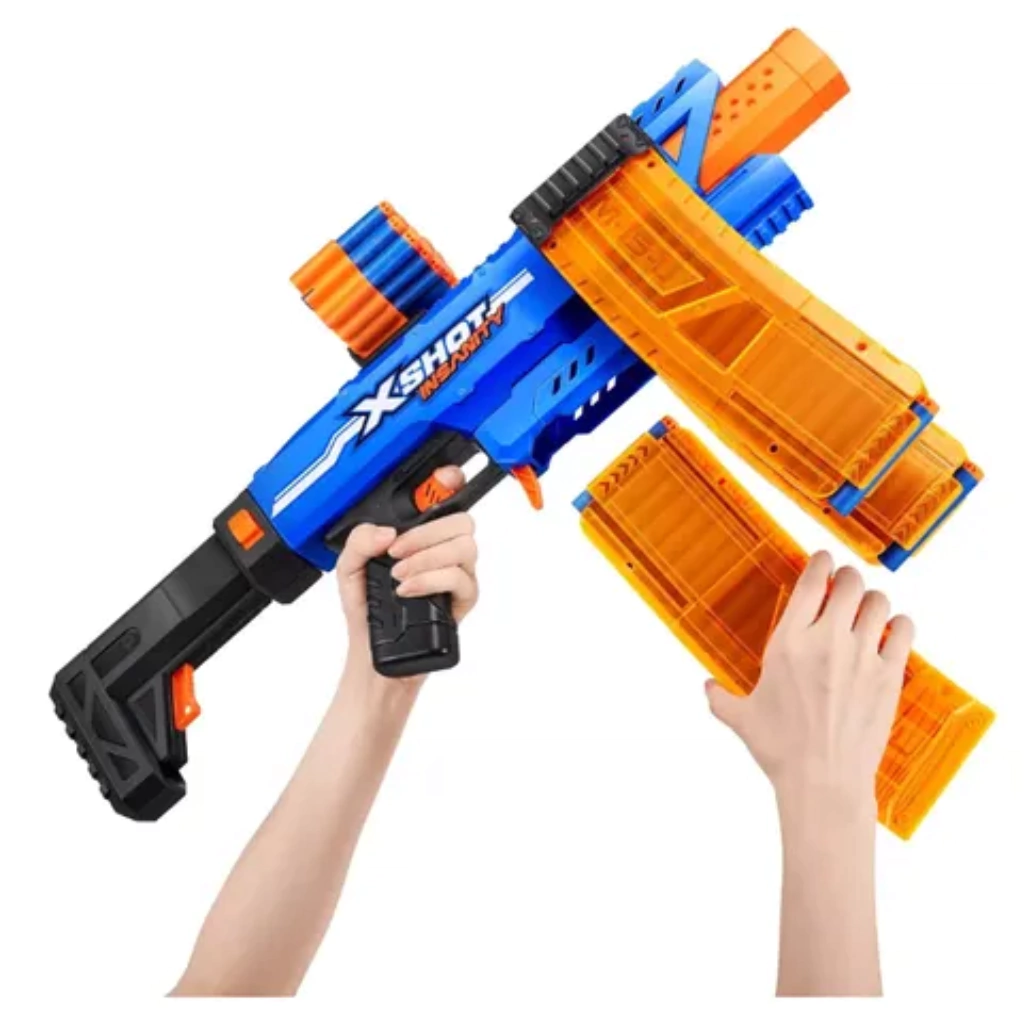 El X-Shot Insanity Motorized Clip Mania lleva la guerra de blásters a nuevas cotas con su sistema de disparo semiautomático con volante de inercia. Equipado con un cargador de 15 dardos, este bláster incluye tres cargadores, un soporte para dardos y conectores que permiten combinar blásters y cargadores para obtener la máxima potencia de fuego. Con un total de 72 dardos incluidos, estarás preparado para una partida prolongada, mientras que la culata extensible y el riel X-Shot ofrecen la máxima personalización.
