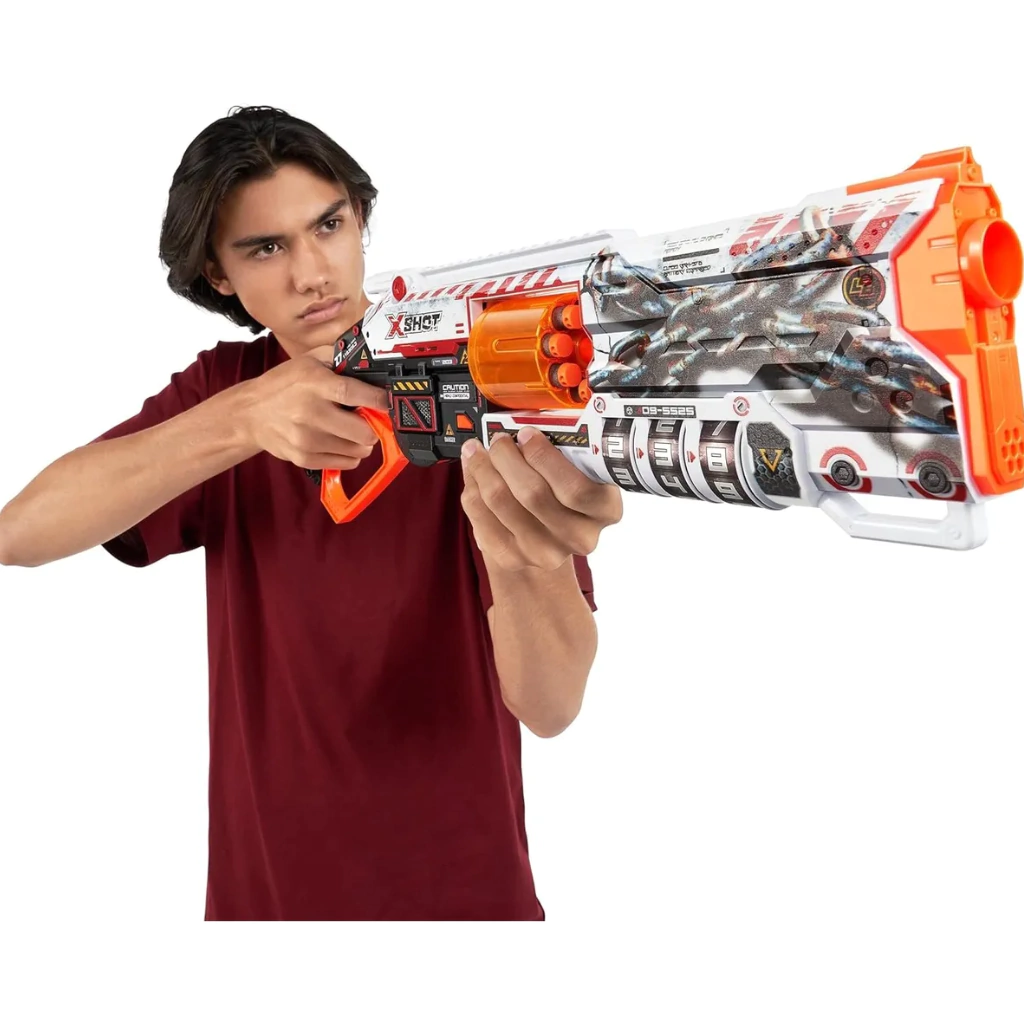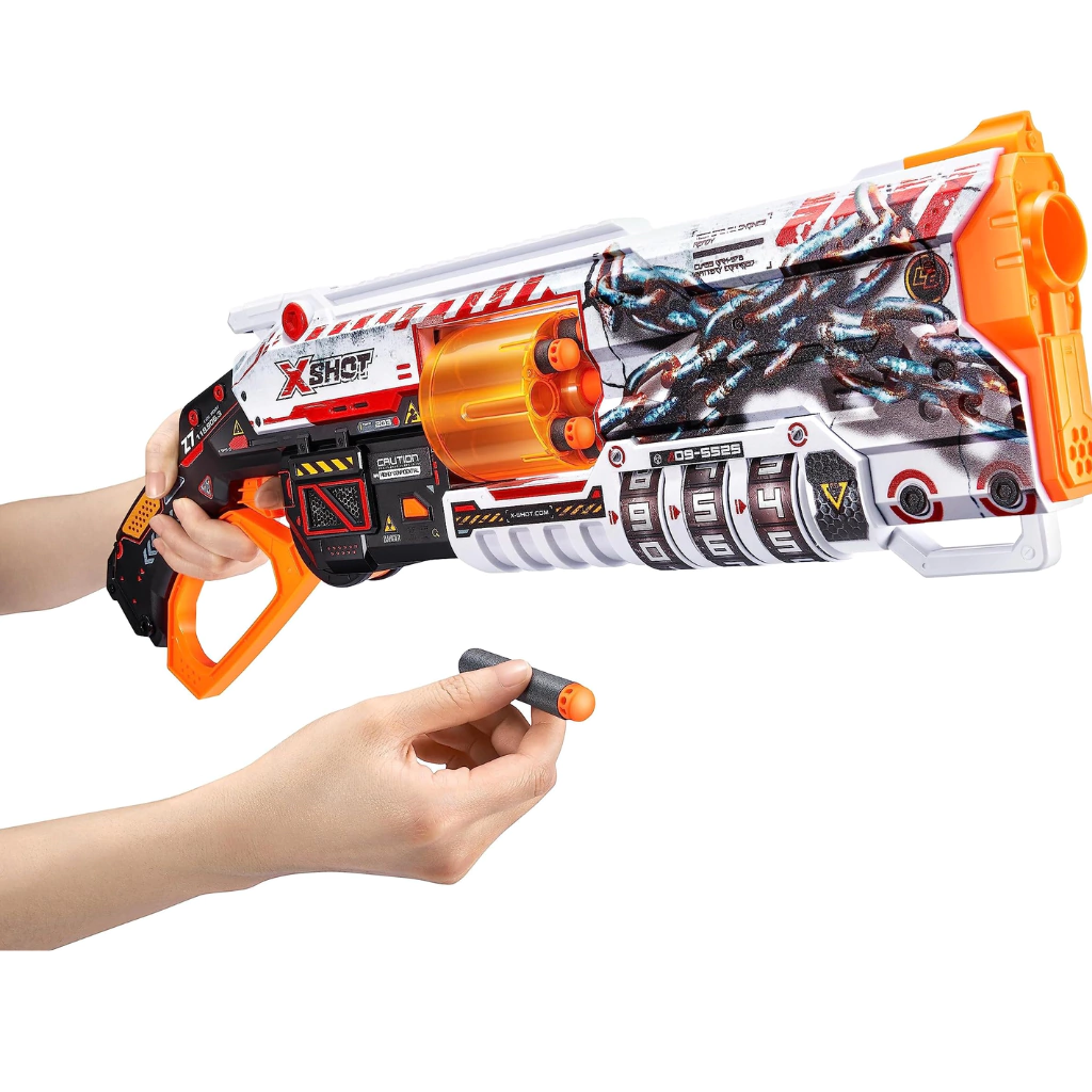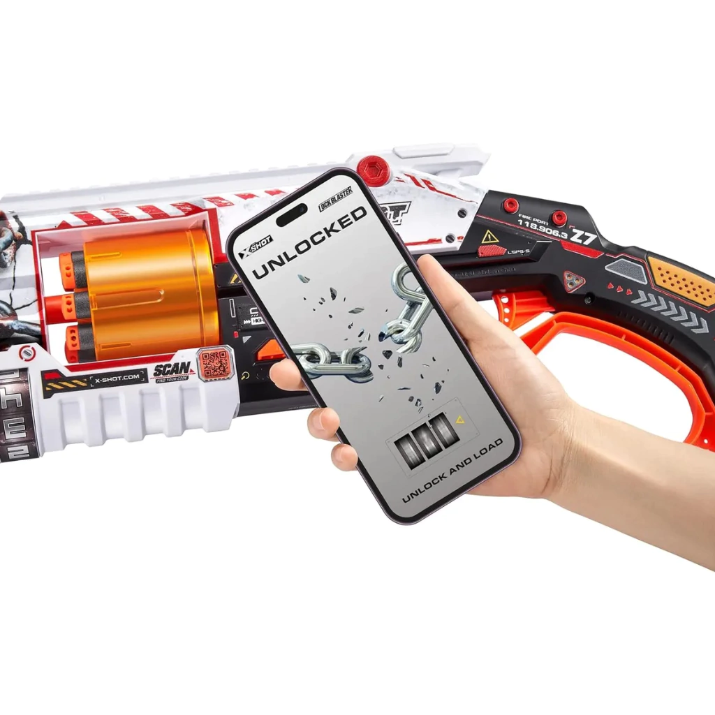 ¡El X-Shot Skins Lock Blaster pone el poder en tus manos! Cada Lock Blaster viene con un código QR para descubrir tu combinación de bloqueo única. ¡Desbloquea tu lanzador para comenzar la diversión! El Lock Blaster tiene un cañón giratorio de 6 dardos para atravesar dardos en segundos y golpear objetivos de hasta 22 metros de distancia. Cuando terminen las batallas, bloquea tu bláster y nadie más podrá usarlo. Elija diferente, elija X-Shot Skins.